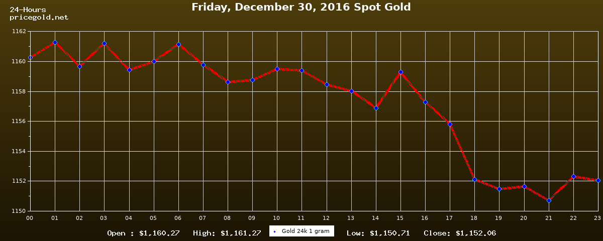 On Friday, December 30, 2016, the gold price was $1,152.06 per ounce. The price of gold per gram is $37.04. Today's highest gold price was $1,161.27, while the lowest was $1,150.71.
