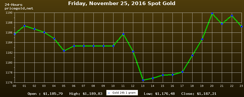On Friday, November 25, 2016, the gold price was $1,187.21 per ounce. The price of gold per gram is $38.17. Today's highest gold price was $1,189.83, while the lowest was $1,176.48.