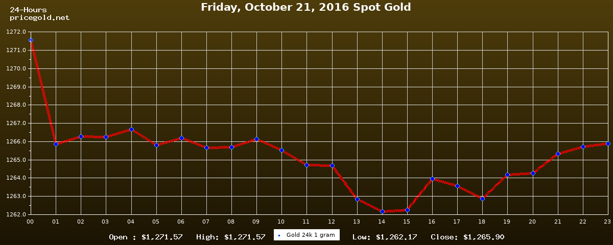 On Friday, October 21, 2016, the gold price was $1,265.90 per ounce. The price of gold per gram is $40.70. Today's highest gold price was $1,271.57, while the lowest was $1,262.17.