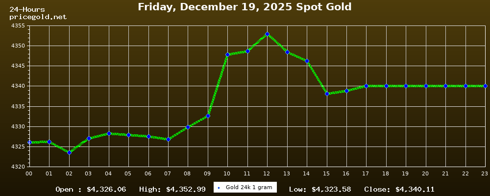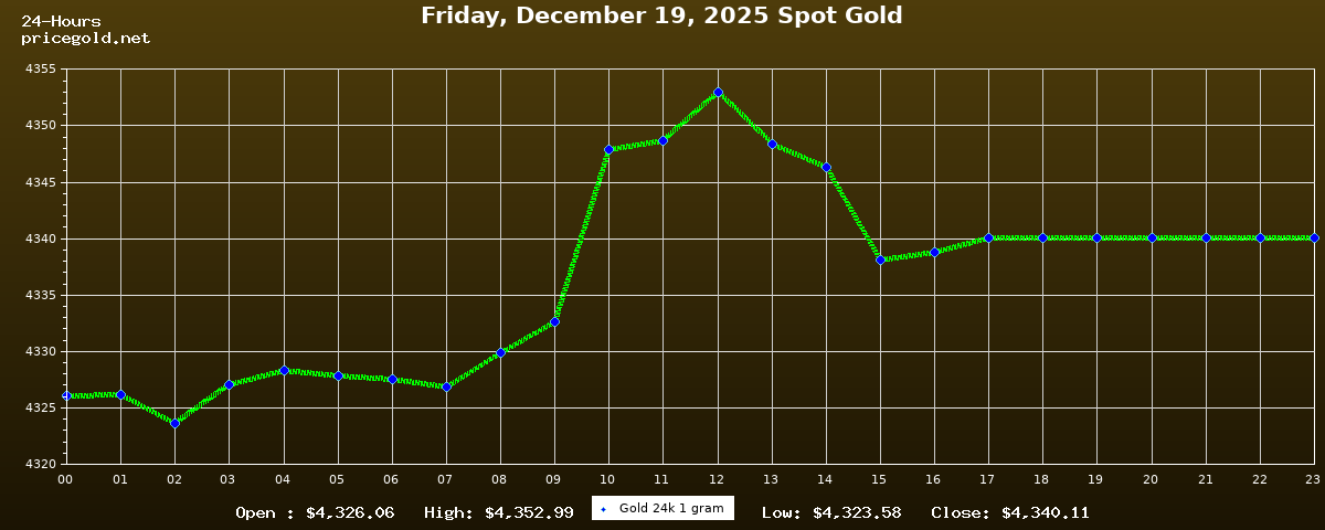 On Friday, December 19, 2025, the gold price was $4,340.11 per ounce. The price of gold per gram is $139.54. Today's highest gold price was $4,352.99, while the lowest was $4,323.58.