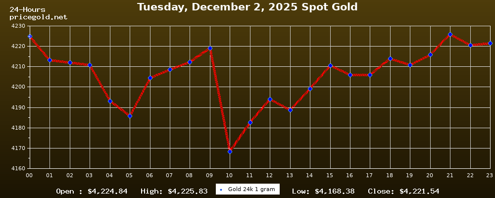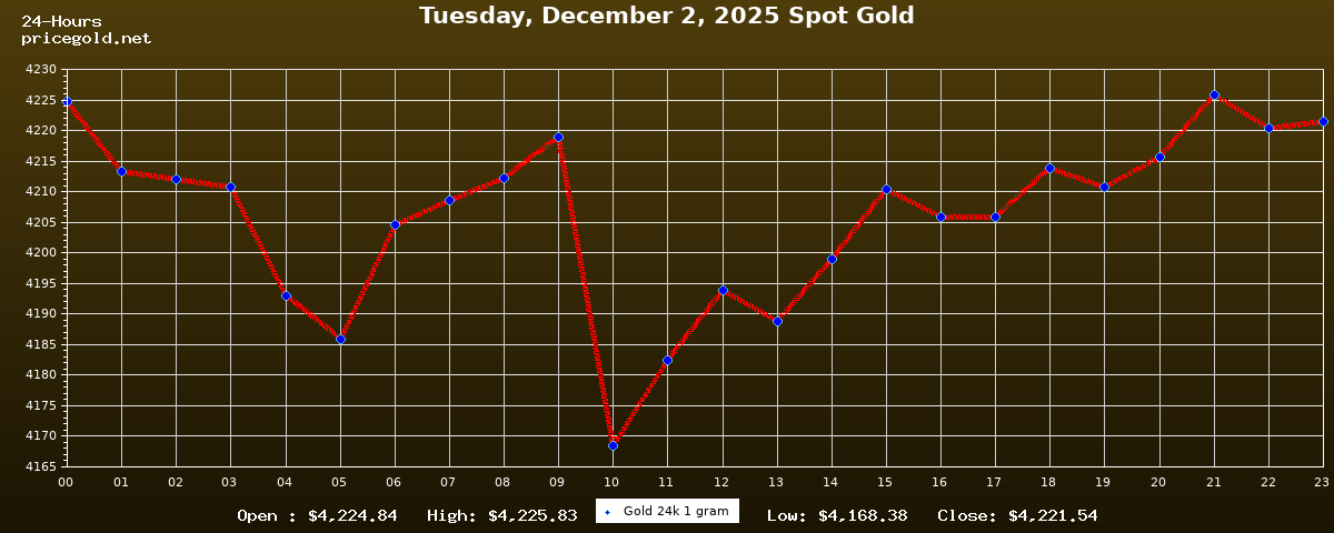 On Tuesday, December 2, 2025, the gold price was $4,221.54 per ounce. The price of gold per gram is $135.73. Today's highest gold price was $4,225.83, while the lowest was $4,168.38.