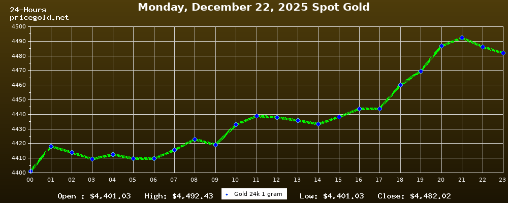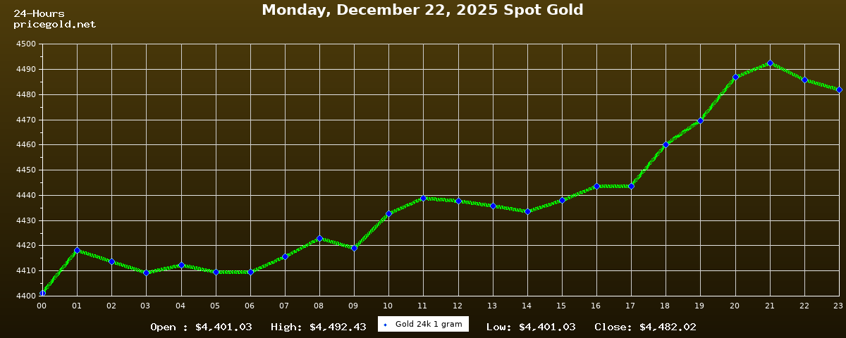 On Monday, December 22, 2025, the gold price was $4,482.02 per ounce. The price of gold per gram is $144.10. Today's highest gold price was $4,492.43, while the lowest was $4,401.03.