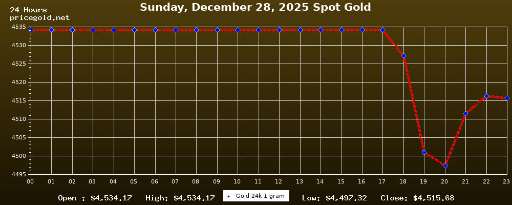 On Sunday, December 28, 2025, the gold price was $4,515.68 per ounce. The price of gold per gram is $145.18. Today's highest gold price was $4,534.17, while the lowest was $4,497.32.