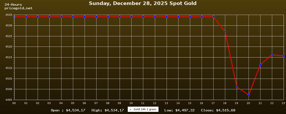 On Sunday, December 28, 2025, the gold price was $4,515.68 per ounce. The price of gold per gram is $145.18. Today's highest gold price was $4,534.17, while the lowest was $4,497.32.