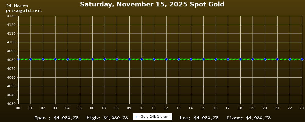 On Saturday, November 15, 2025, the gold price was $4,080.78 per ounce. The price of gold per gram is $131.20. Today's highest gold price was $4,080.78, while the lowest was $4,080.78.
