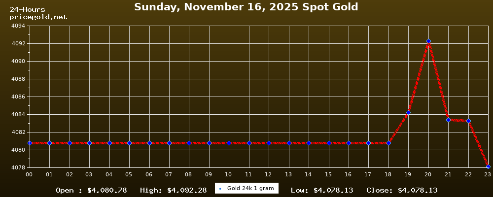 On Sunday, November 16, 2025, the gold price was $4,078.13 per ounce. The price of gold per gram is $131.12. Today's highest gold price was $4,092.28, while the lowest was $4,078.13.