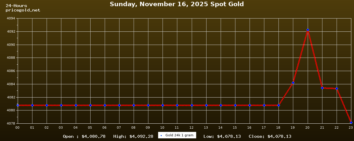 On Sunday, November 16, 2025, the gold price was $4,078.13 per ounce. The price of gold per gram is $131.12. Today's highest gold price was $4,092.28, while the lowest was $4,078.13.