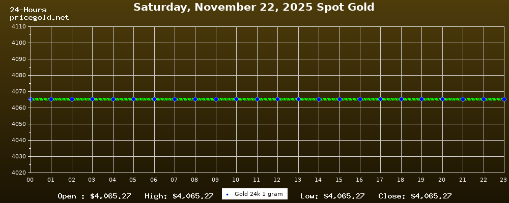 On Saturday, November 22, 2025, the gold price was $4,065.27 per ounce. The price of gold per gram is $130.70. Today's highest gold price was $4,065.27, while the lowest was $4,065.27.