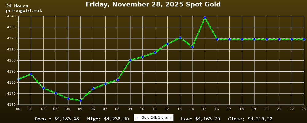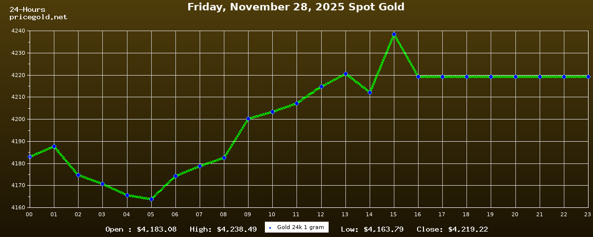 On Friday, November 28, 2025, the gold price was $4,219.22 per ounce. The price of gold per gram is $135.65. Today's highest gold price was $4,238.49, while the lowest was $4,163.79.