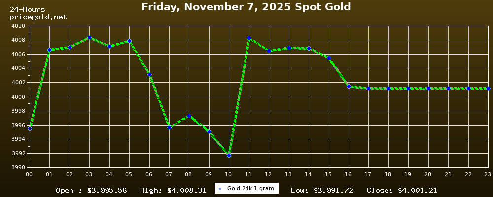 On Friday, November 7, 2025, the gold price was $4,001.21 per ounce. The price of gold per gram is $128.64. Today's highest gold price was $4,008.31, while the lowest was $3,991.72.