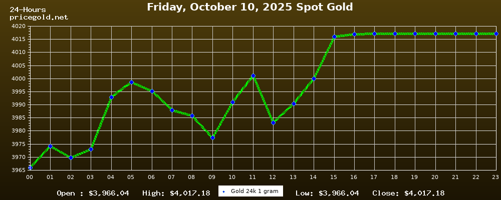 On Friday, October 10, 2025, the gold price was $4,017.18 per ounce. The price of gold per gram is $129.16. Today's highest gold price was $4,017.18, while the lowest was $3,966.04.