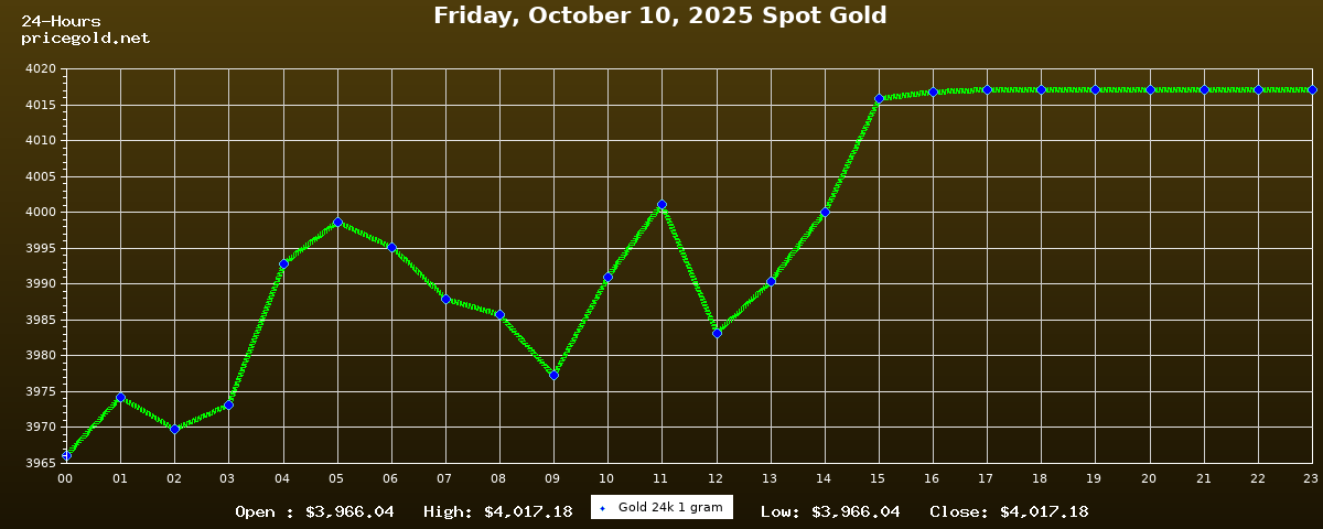 On Friday, October 10, 2025, the gold price was $4,017.18 per ounce. The price of gold per gram is $129.16. Today's highest gold price was $4,017.18, while the lowest was $3,966.04.