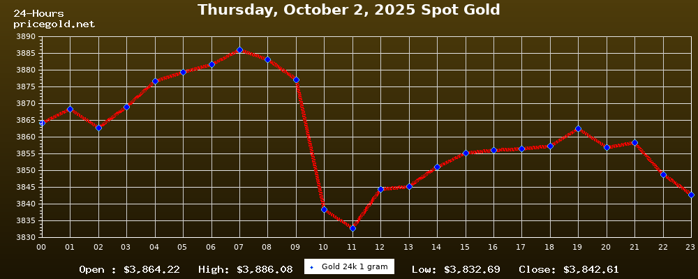 On Thursday, October 2, 2025, the gold price was $3,842.61 per ounce. The price of gold per gram is $123.54. Today's highest gold price was $3,886.08, while the lowest was $3,832.69.