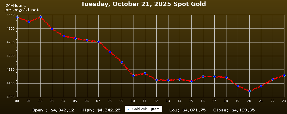 On Tuesday, October 21, 2025, the gold price was $4,129.65 per ounce. The price of gold per gram is $132.77. Today's highest gold price was $4,342.25, while the lowest was $4,071.75.