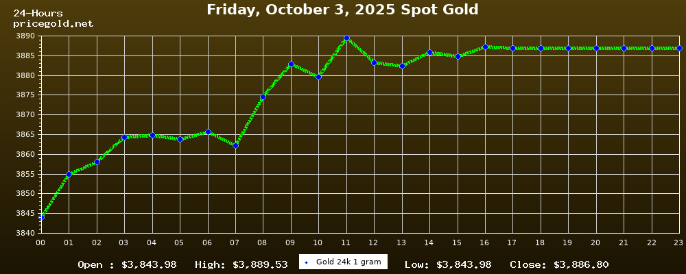 On Friday, October 3, 2025, the gold price was $3,886.80 per ounce. The price of gold per gram is $124.96. Today's highest gold price was $3,889.53, while the lowest was $3,843.98.