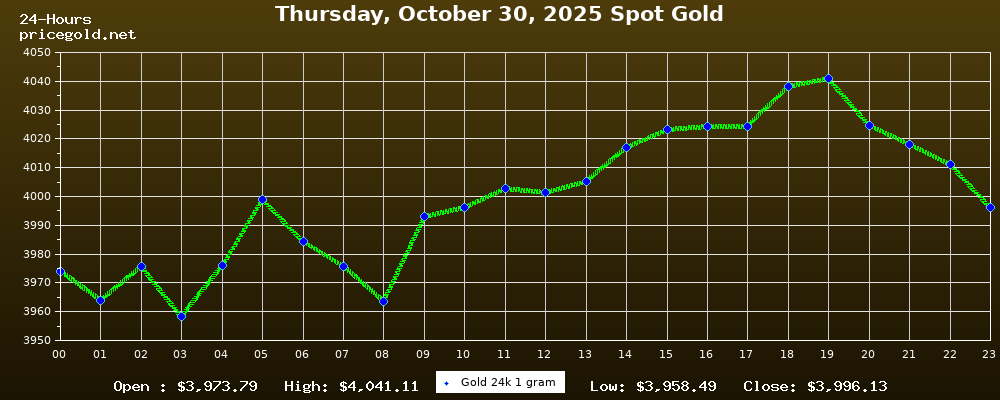 On Thursday, October 30, 2025, the gold price was $3,996.13 per ounce. The price of gold per gram is $128.48. Today's highest gold price was $4,041.11, while the lowest was $3,958.49.