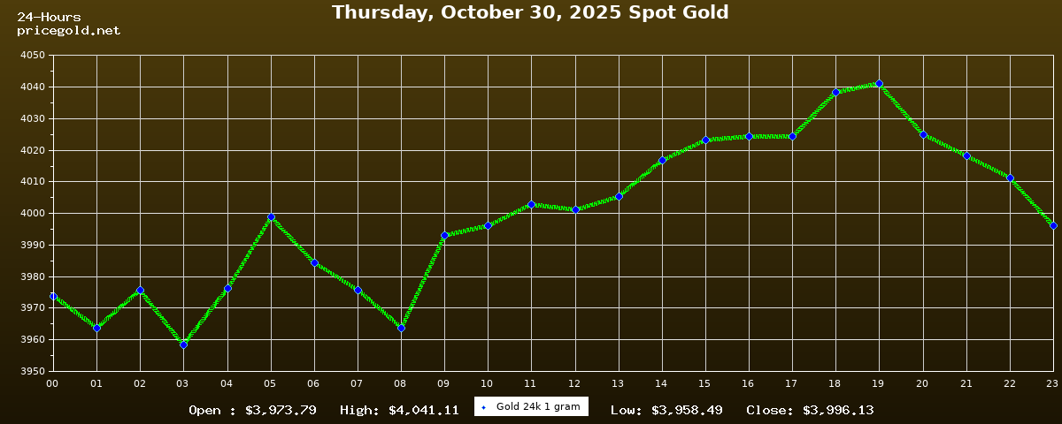 On Thursday, October 30, 2025, the gold price was $3,996.13 per ounce. The price of gold per gram is $128.48. Today's highest gold price was $4,041.11, while the lowest was $3,958.49.