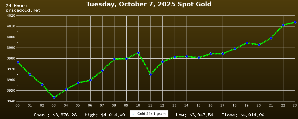 On Tuesday, October 7, 2025, the gold price was $4,014.00 per ounce. The price of gold per gram is $129.05. Today's highest gold price was $4,014.00, while the lowest was $3,943.54.