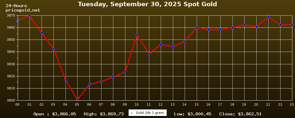 On Tuesday, September 30, 2025, the gold price was $3,862.51 per ounce. The price of gold per gram is $124.18. Today's highest gold price was $3,869.73, while the lowest was $3,800.45.