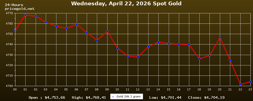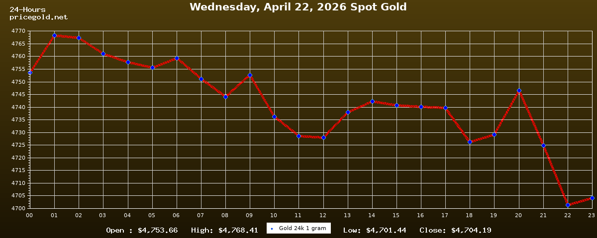 On Wednesday, April 22, 2026, the gold price was $4,704.19 per ounce. The price of gold per gram is $151.24. Today's highest gold price was $4,768.41, while the lowest was $4,701.44.