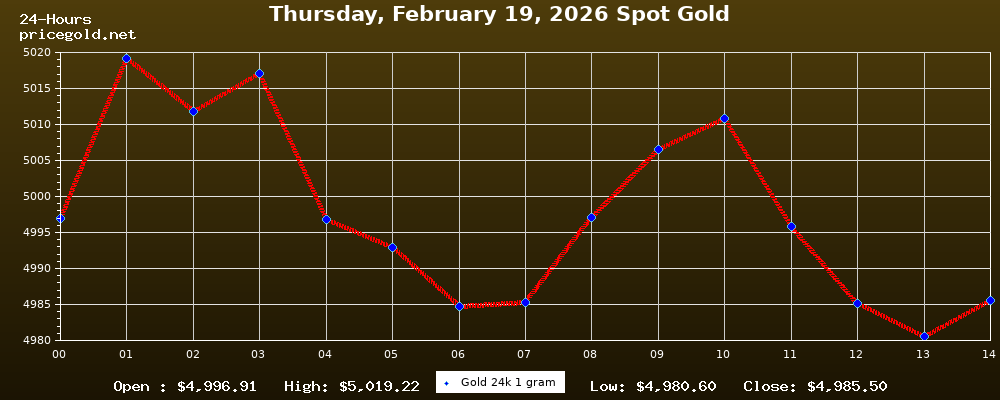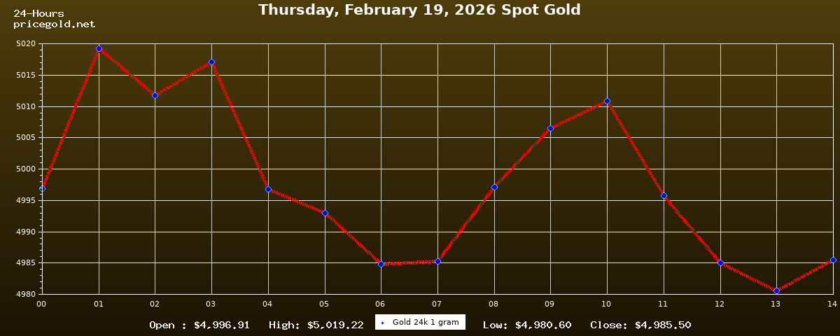 On Thursday, February 19, 2026, the gold price was $4,985.50 per ounce. The price of gold per gram is $160.29. Today's highest gold price was $5,019.22, while the lowest was $4,980.60.