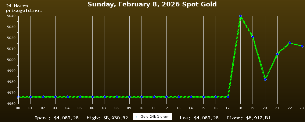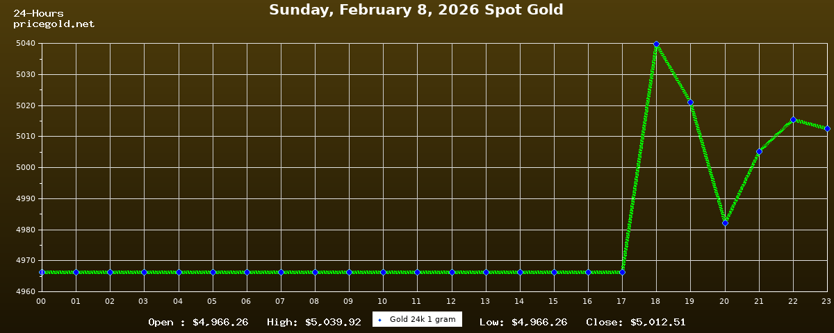 On Sunday, February 8, 2026, the gold price was $5,012.51 per ounce. The price of gold per gram is $161.16. Today's highest gold price was $5,039.92, while the lowest was $4,966.26.