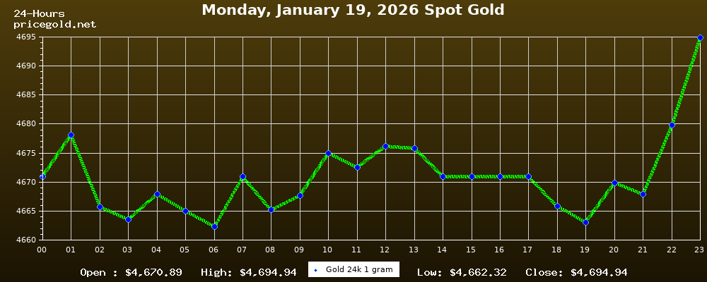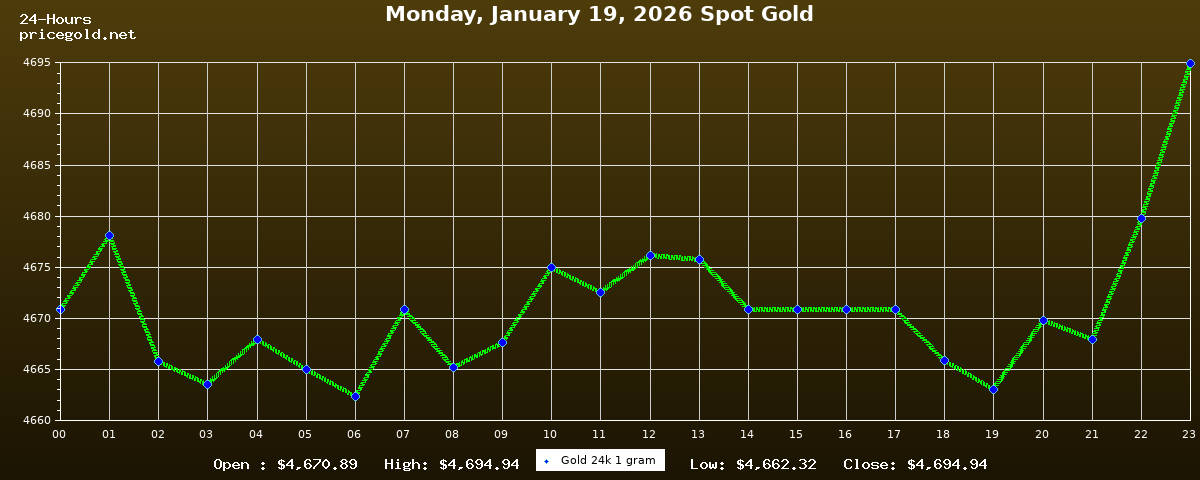On Monday, January 19, 2026, the gold price was $4,694.94 per ounce. The price of gold per gram is $150.95. Today's highest gold price was $4,694.94, while the lowest was $4,662.32.