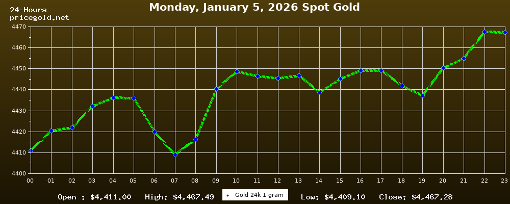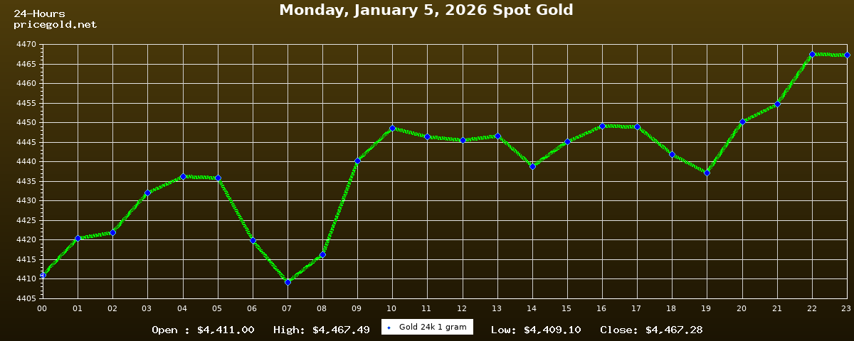 On Monday, January 5, 2026, the gold price was $4,467.28 per ounce. The price of gold per gram is $143.63. Today's highest gold price was $4,467.49, while the lowest was $4,409.10.