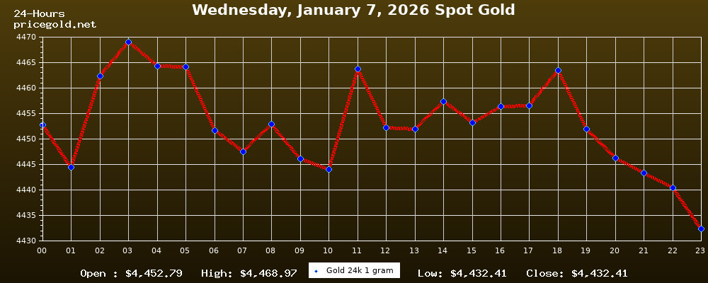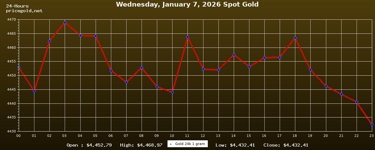 On Wednesday, January 7, 2026, the gold price was $4,432.41 per ounce. The price of gold per gram is $142.51. Today's highest gold price was $4,468.97, while the lowest was $4,432.41.