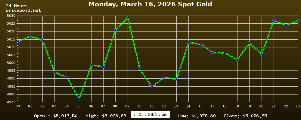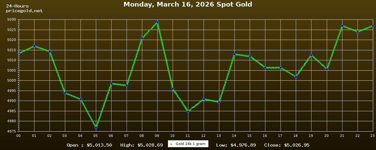 On Monday, March 16, 2026, the gold price was $5,026.95 per ounce. The price of gold per gram is $161.62. Today's highest gold price was $5,028.69, while the lowest was $4,976.89.