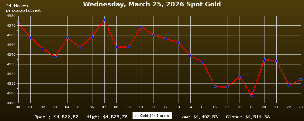 On Wednesday, March 25, 2026, the gold price was $4,514.38 per ounce. The price of gold per gram is $145.14. Today's highest gold price was $4,575.78, while the lowest was $4,497.53.