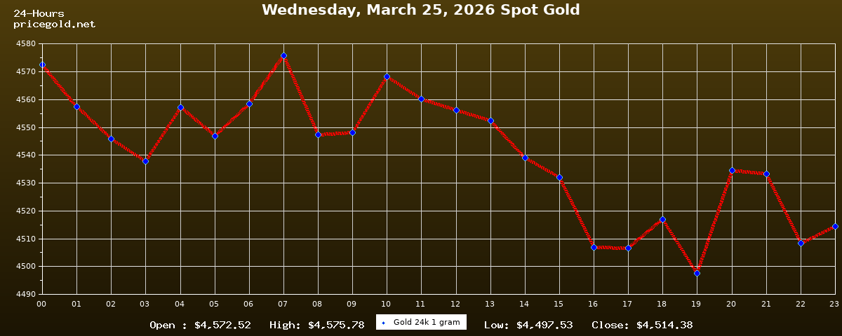 On Wednesday, March 25, 2026, the gold price was $4,514.38 per ounce. The price of gold per gram is $145.14. Today's highest gold price was $4,575.78, while the lowest was $4,497.53.