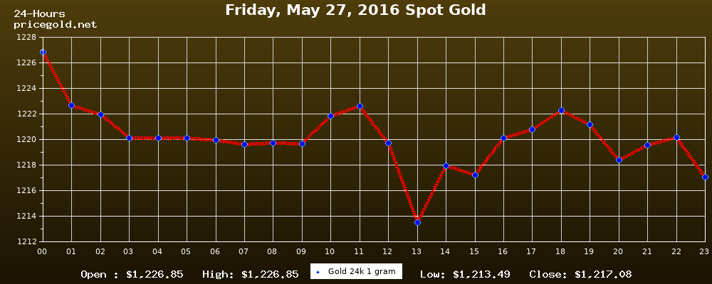 في يوم الجمعة، ٢٧ مايو ٢٠١٦ بلغ سعر الذهب للأوقية (الأونصة) الواحدة $1,217.08. وبلغ سعر الجرام الذهب الواحد $39.13. وقد وصل أعلى سعر للذهب في هذا اليوم $1,226.85، بينما كان أدنى سعر $1,213.49.