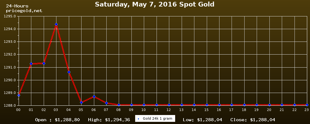 في يوم السبت، ٧ مايو ٢٠١٦ بلغ سعر الذهب للأوقية (الأونصة) الواحدة $1,288.04. وبلغ سعر الجرام الذهب الواحد $41.41. وقد وصل أعلى سعر للذهب في هذا اليوم $1,294.36، بينما كان أدنى سعر $1,288.04.