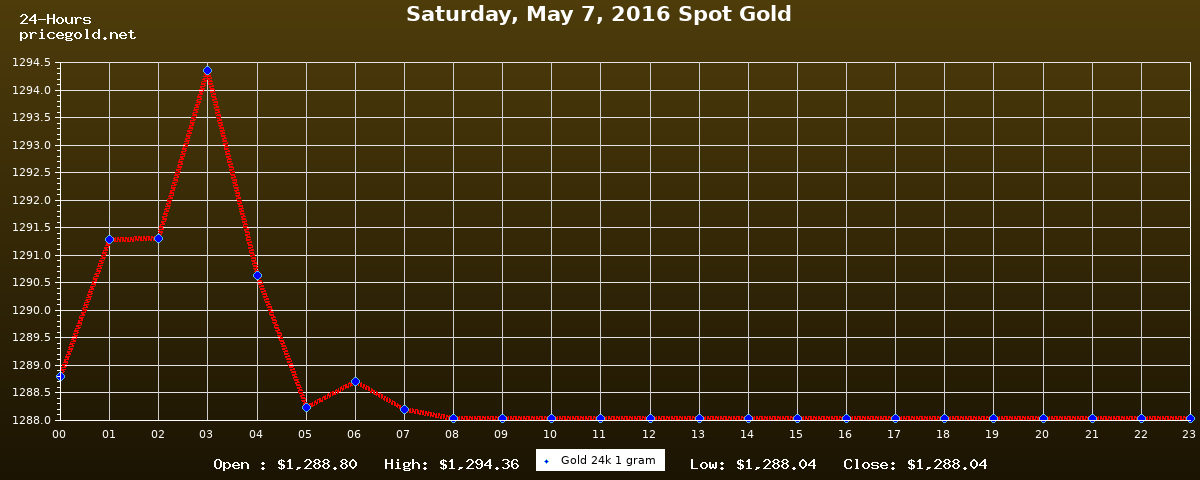 في يوم السبت، ٧ مايو ٢٠١٦ بلغ سعر الذهب للأوقية (الأونصة) الواحدة $1,288.04. وبلغ سعر الجرام الذهب الواحد $41.41. وقد وصل أعلى سعر للذهب في هذا اليوم $1,294.36، بينما كان أدنى سعر $1,288.04.