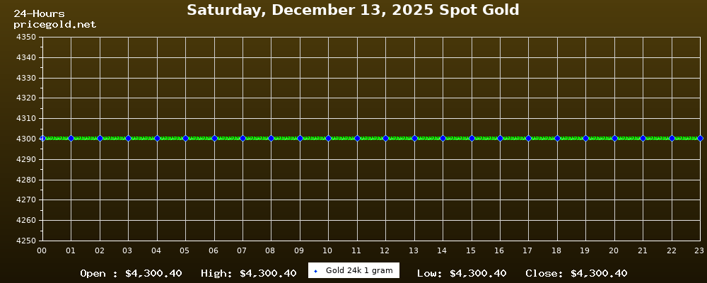 في يوم السبت، ١٣ ديسمبر ٢٠٢٥ بلغ سعر الذهب للأوقية (الأونصة) الواحدة $4,300.40. وبلغ سعر الجرام الذهب الواحد $138.26. وقد وصل أعلى سعر للذهب في هذا اليوم $4,300.40، بينما كان أدنى سعر $4,300.40.