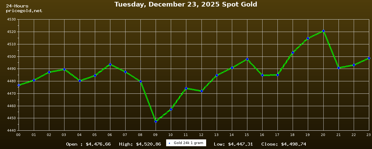 في يوم الثلاثاء، ٢٣ ديسمبر ٢٠٢٥ بلغ سعر الذهب للأوقية (الأونصة) الواحدة $4,498.74. وبلغ سعر الجرام الذهب الواحد $144.64. وقد وصل أعلى سعر للذهب في هذا اليوم $4,520.86، بينما كان أدنى سعر $4,447.31.