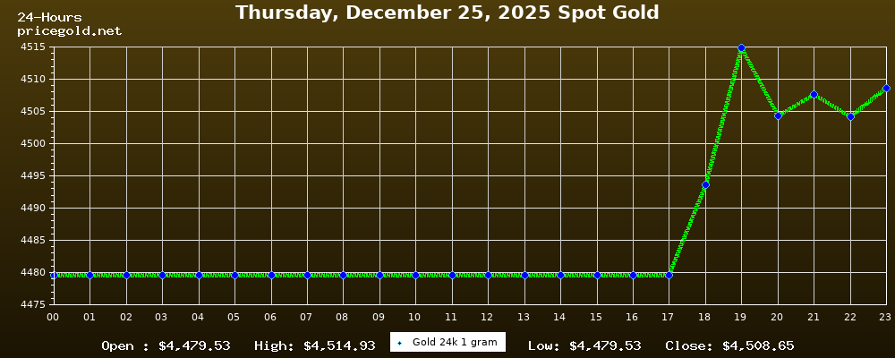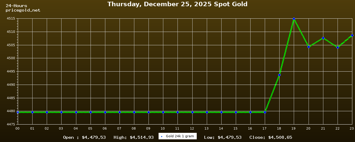 في يوم الخميس، ٢٥ ديسمبر ٢٠٢٥ بلغ سعر الذهب للأوقية (الأونصة) الواحدة $4,508.65. وبلغ سعر الجرام الذهب الواحد $144.96. وقد وصل أعلى سعر للذهب في هذا اليوم $4,514.93، بينما كان أدنى سعر $4,479.53.