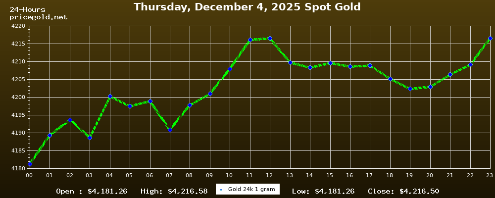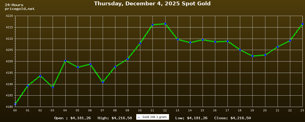 في يوم الخميس، ٤ ديسمبر ٢٠٢٥ بلغ سعر الذهب للأوقية (الأونصة) الواحدة $4,216.50. وبلغ سعر الجرام الذهب الواحد $135.56. وقد وصل أعلى سعر للذهب في هذا اليوم $4,216.58، بينما كان أدنى سعر $4,181.26.