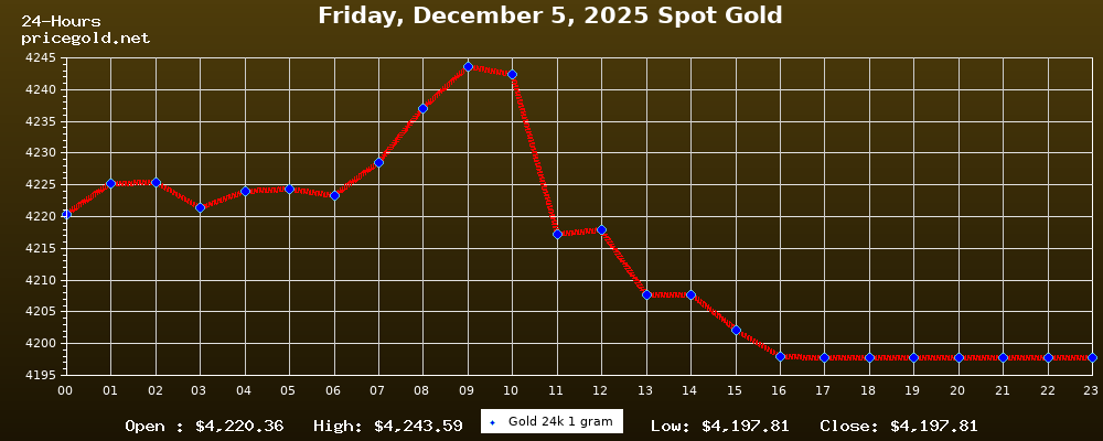 في يوم الجمعة، ٥ ديسمبر ٢٠٢٥ بلغ سعر الذهب للأوقية (الأونصة) الواحدة $4,197.81. وبلغ سعر الجرام الذهب الواحد $134.96. وقد وصل أعلى سعر للذهب في هذا اليوم $4,243.59، بينما كان أدنى سعر $4,197.81.