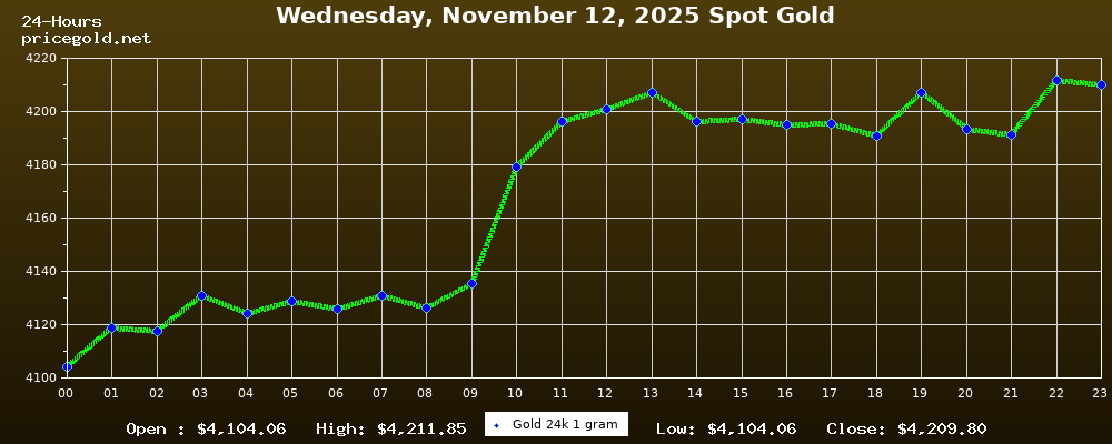 في يوم الأربعاء، ١٢ نوفمبر ٢٠٢٥ بلغ سعر الذهب للأوقية (الأونصة) الواحدة $4,209.80. وبلغ سعر الجرام الذهب الواحد $135.35. وقد وصل أعلى سعر للذهب في هذا اليوم $4,211.85، بينما كان أدنى سعر $4,104.06.