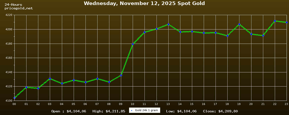 في يوم الأربعاء، ١٢ نوفمبر ٢٠٢٥ بلغ سعر الذهب للأوقية (الأونصة) الواحدة $4,209.80. وبلغ سعر الجرام الذهب الواحد $135.35. وقد وصل أعلى سعر للذهب في هذا اليوم $4,211.85، بينما كان أدنى سعر $4,104.06.