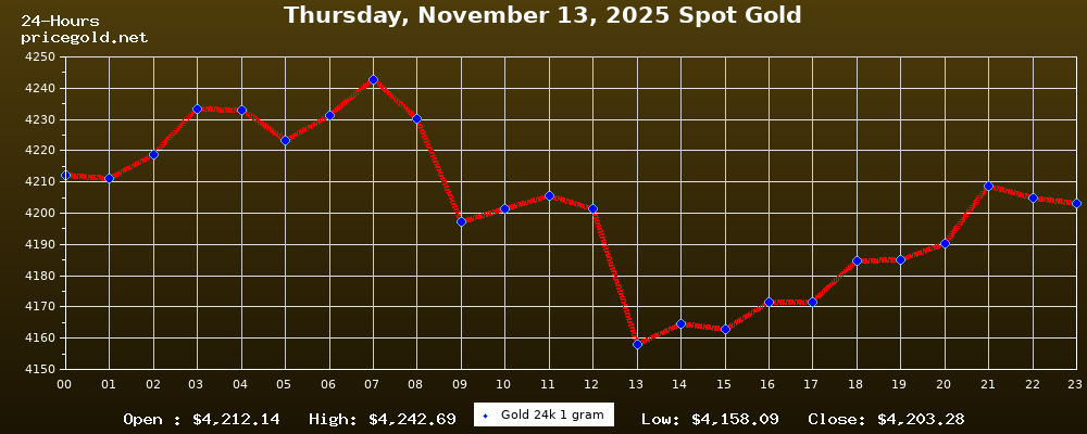 في يوم الخميس، ١٣ نوفمبر ٢٠٢٥ بلغ سعر الذهب للأوقية (الأونصة) الواحدة $4,203.28. وبلغ سعر الجرام الذهب الواحد $135.14. وقد وصل أعلى سعر للذهب في هذا اليوم $4,242.69، بينما كان أدنى سعر $4,158.09.