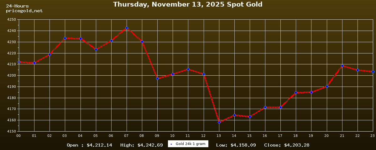 في يوم الخميس، ١٣ نوفمبر ٢٠٢٥ بلغ سعر الذهب للأوقية (الأونصة) الواحدة $4,203.28. وبلغ سعر الجرام الذهب الواحد $135.14. وقد وصل أعلى سعر للذهب في هذا اليوم $4,242.69، بينما كان أدنى سعر $4,158.09.