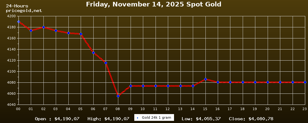 في يوم الجمعة، ١٤ نوفمبر ٢٠٢٥ بلغ سعر الذهب للأوقية (الأونصة) الواحدة $4,080.78. وبلغ سعر الجرام الذهب الواحد $131.20. وقد وصل أعلى سعر للذهب في هذا اليوم $4,190.07، بينما كان أدنى سعر $4,055.37.