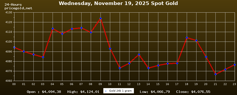 في يوم الأربعاء، ١٩ نوفمبر ٢٠٢٥ بلغ سعر الذهب للأوقية (الأونصة) الواحدة $4,076.55. وبلغ سعر الجرام الذهب الواحد $131.06. وقد وصل أعلى سعر للذهب في هذا اليوم $4,124.01، بينما كان أدنى سعر $4,066.79.