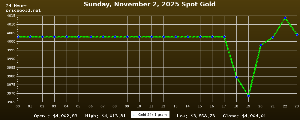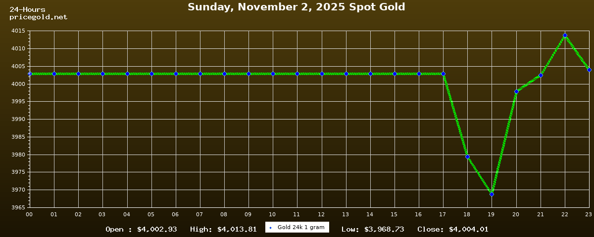 في يوم الأحد، ٢ نوفمبر ٢٠٢٥ بلغ سعر الذهب للأوقية (الأونصة) الواحدة $4,004.01. وبلغ سعر الجرام الذهب الواحد $128.73. وقد وصل أعلى سعر للذهب في هذا اليوم $4,013.81، بينما كان أدنى سعر $3,968.73.