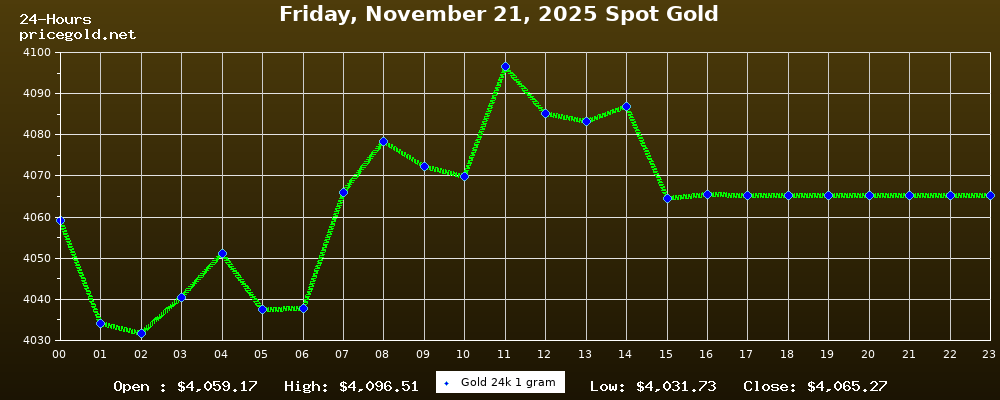 في يوم الجمعة، ٢١ نوفمبر ٢٠٢٥ بلغ سعر الذهب للأوقية (الأونصة) الواحدة $4,065.27. وبلغ سعر الجرام الذهب الواحد $130.70. وقد وصل أعلى سعر للذهب في هذا اليوم $4,096.51، بينما كان أدنى سعر $4,031.73.