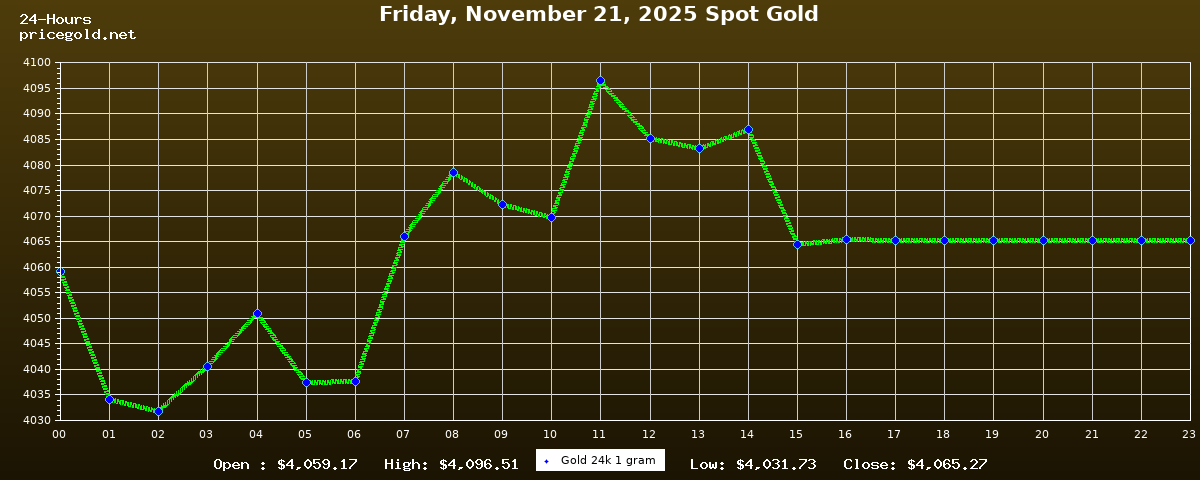 في يوم الجمعة، ٢١ نوفمبر ٢٠٢٥ بلغ سعر الذهب للأوقية (الأونصة) الواحدة $4,065.27. وبلغ سعر الجرام الذهب الواحد $130.70. وقد وصل أعلى سعر للذهب في هذا اليوم $4,096.51، بينما كان أدنى سعر $4,031.73.
