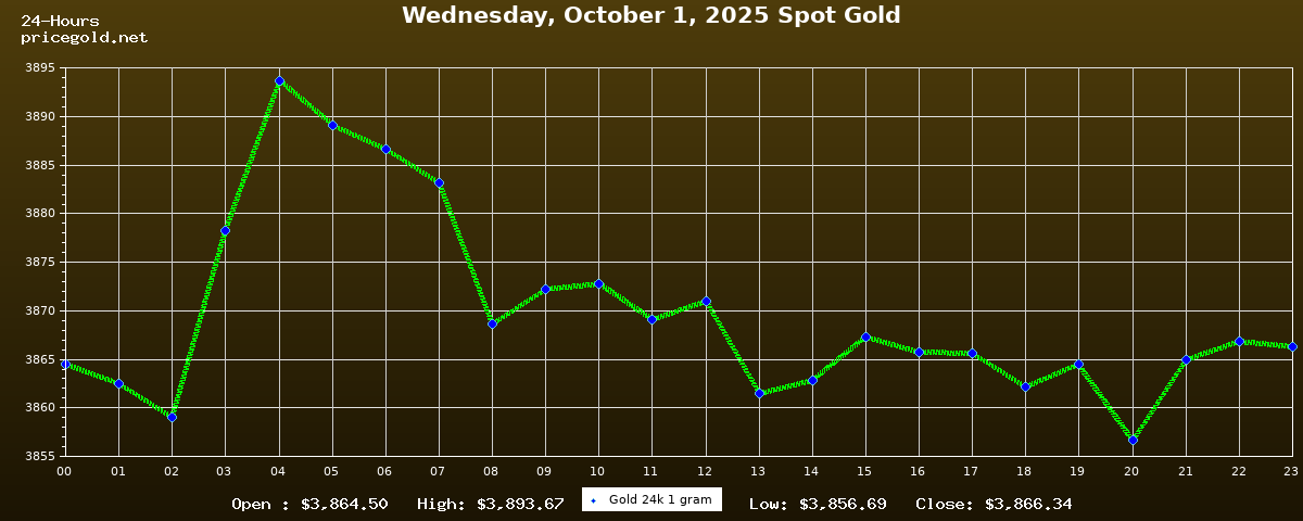 في يوم الأربعاء، ١ أكتوبر ٢٠٢٥ بلغ سعر الذهب للأوقية (الأونصة) الواحدة $3,866.34. وبلغ سعر الجرام الذهب الواحد $124.31. وقد وصل أعلى سعر للذهب في هذا اليوم $3,893.67، بينما كان أدنى سعر $3,856.69.